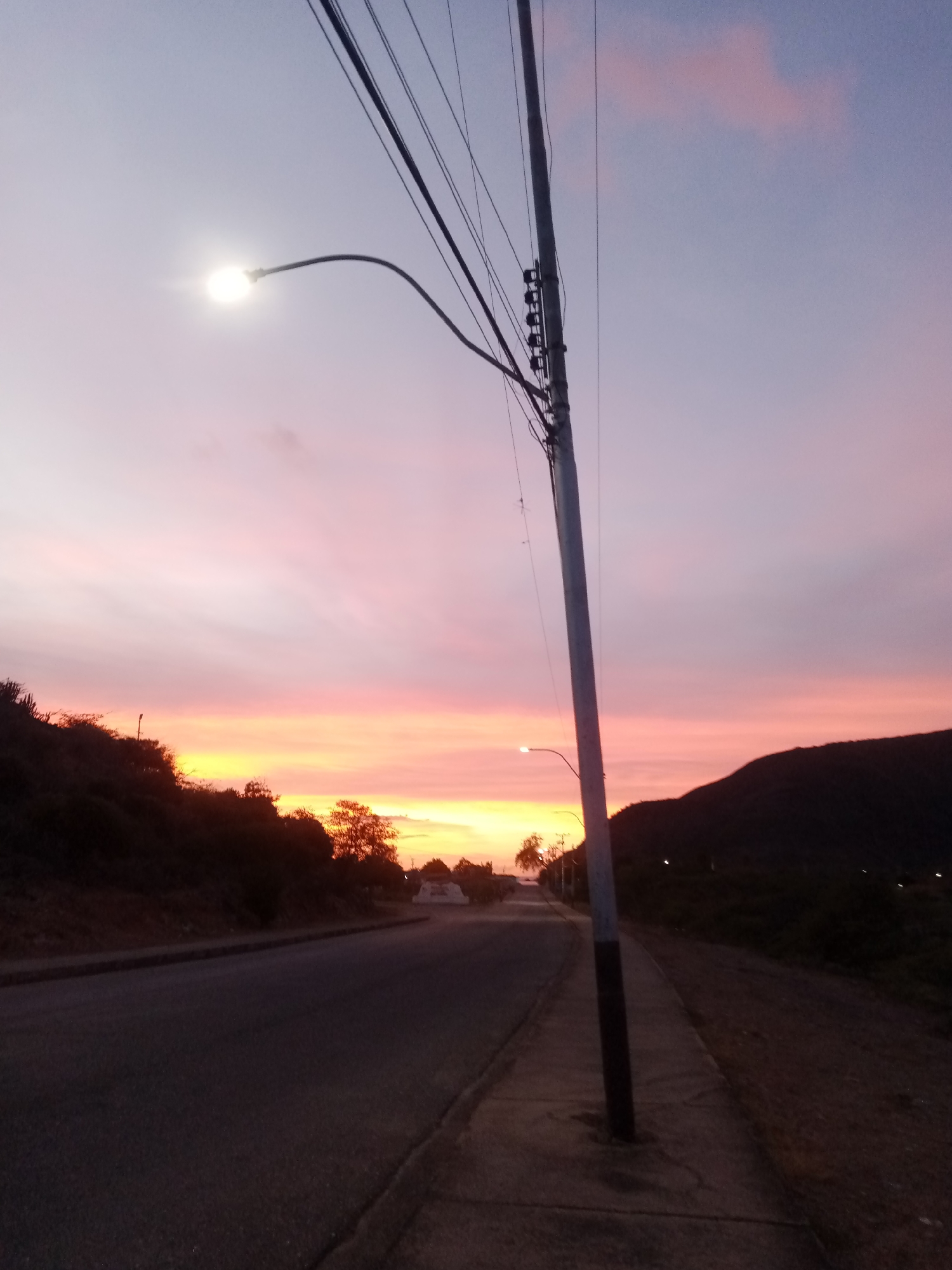 The image depicts a street scene in Juan Griego, Venezuela at dusk. A paved road runs into the distance, flanked by sidewalks and vegetation-covered hills on either side. A utility pole stands on the right side of the frame, with electrical wires extending overhead. Streetlights illuminate the scene, one on the left side closer to the viewer and another further down the road. The sky is a blend of pink, orange, and purple hues, indicating sunset.