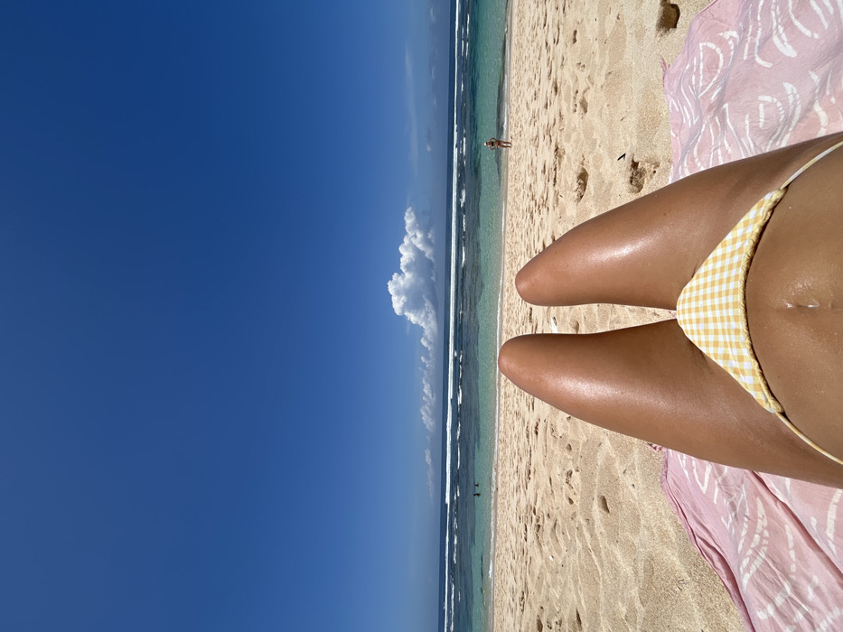 The image depicts a first-person perspective from a supine position on a sandy beach in Ungasan, Indonesia, on a clear day. In the immediate foreground, the tanned thighs and lower abdomen of an individual are visible, wearing a yellow and white gingham-patterned bikini bottom. These body parts rest on a light pink beach towel adorned with a white patterned design. Beyond the towel and legs, the environment consists of light brown sand, extending towards the ocean. The ocean water transitions from a clear, shallow turquoise near the shore to a darker blue further out, marked by multiple lines of white breaking waves, indicative of a reef or surf. Three additional individuals are present in the scene. Two figures are partially submerged in the turquoise water on the left side of the frame, appearing to be swimming or wading. A third individual stands upright at the water's edge on the right side of the beach, facing the ocean, wearing a dark swimsuit and possibly a hat. The sky above is a vibrant, cloudless blue, except for a large, well-defined white cumulus cloud formation situated centrally on the horizon line.