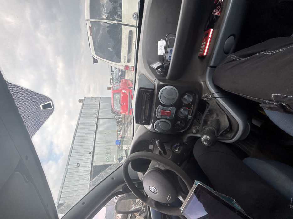 The image presents a forensic view from inside a Fiat Doblo vehicle, looking forward into an industrial yard in Shumen, Bulgaria. The foreground shows the vehicle's interior: a steering wheel with a Fiat emblem on the left, and a dashboard featuring a radio unit, circular air vents, and climate controls. A manual gear stick is centrally located. A tablet rests on the lap of an individual seated in the driver's position. Another individual's legs, wearing dark pants, are visible in the passenger footwell. On the passenger side dashboard, a red rectangular electronic device, a receipt, and a phone in a holder are present. Beyond the vehicle's windshield, an overcast sky hangs above an outdoor environment indicative of an auto wrecking or scrap yard. A large, grey corrugated metal building stands prominently in the left background, with the faded numbers "08934" visible on its side. Piles of various scrap materials, including tires and vehicle components, are scattered on the ground. A red hatchback, specifically a Hyundai i10, is parked facing away from the camera in the mid-ground, positioned to the left of a white Volkswagen Caddy van, which is also parked facing away to the right. Both vehicles are situated within the confines of the yard.
