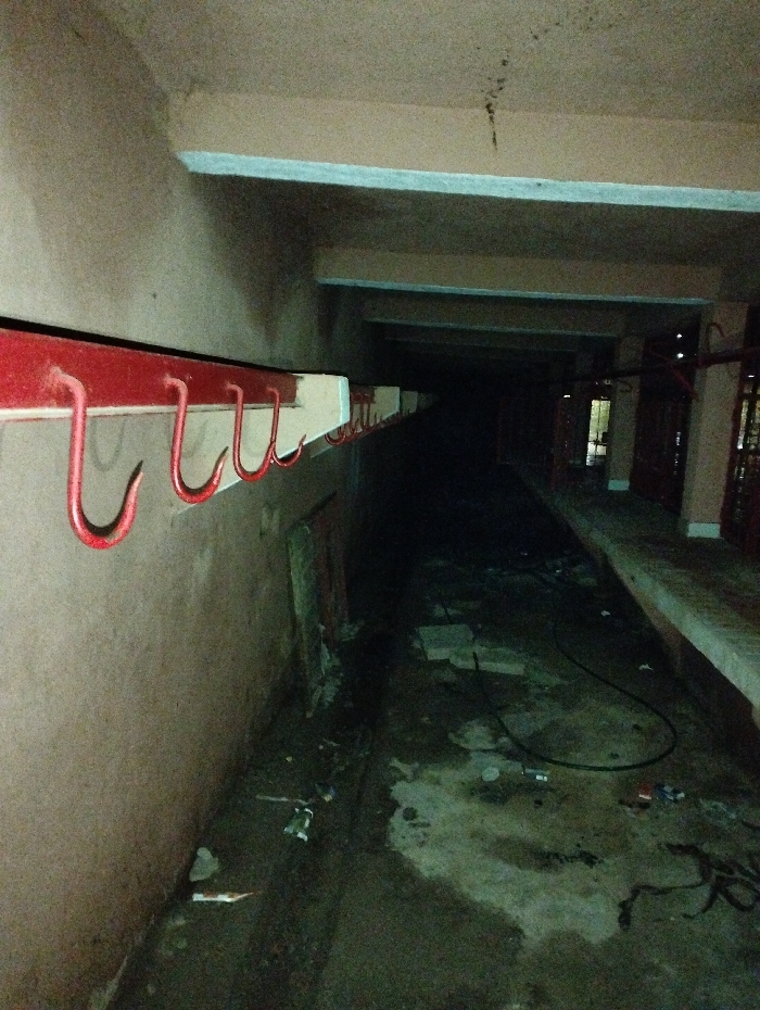 An abandoned, dimly lit hallway features a row of red coat hooks attached to a beige wall on the left