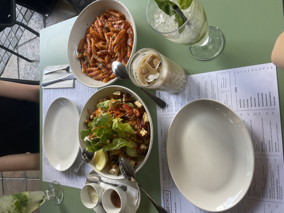 The image displays a top-down view of a dining table at George restaurant in Rosebank, South Africa. The light green table surface is set for a meal, featuring white paper menus with listed prices beneath the plates. In the upper left, a tall glass with a stem holds a beverage containing crushed ice and mint leaves, with a black straw. A person wearing a black top is partially visible behind an empty oval white plate located at the top center. Next to this plate, a folded white napkin holds a silver fork and knife. Centrally on the table, a large white bowl contains penne pasta covered in a rich red tomato sauce, garnished with green herbs, with a silver spoon resting within. To its left, another large white bowl holds a mixed salad with green lettuce, shredded carrots, tomatoes, cucumber, and cubed white elements, possibly tofu or feta cheese, accompanied by a lemon wedge and a silver spoon. Adjacent to the salad, two small white ramekins are stacked on a smaller white plate; the top ramekin contains a white granular substance, likely Parmesan cheese, and the bottom a reddish sauce. Two small silver spoons are placed alongside these ramekins. Between the pasta and salad bowls, a clear glass contains iced coffee with milk and ice cubes. In the lower left, an empty oval white plate is positioned over a menu sheet, which prominently displays "GEORGE" branding and sections like "charcoal grills & mains," "burgers," and "sides." The forearm and hand of a second diner are visible in the lower right corner of the frame. A dark, possibly black, pepper grinder is partially visible between the pasta bowl and the mint drink. The background shows a dark, textured outdoor paving.