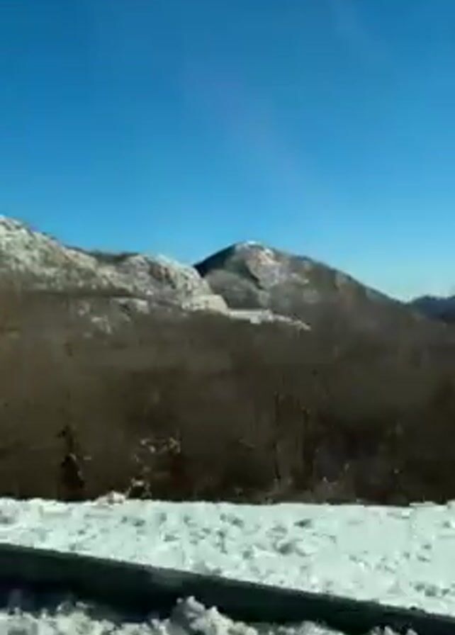 The video depicts a view from inside a vehicle moving along a road. The scenery outside consists of mountains with patches of snow and bare trees against a clear blue sky. The ground is covered in snow, and a metal guardrail is visible along the side of the road. There is no indication of people being present. The camera appears to be handheld or mounted inside the vehicle, capturing the motion of the car as it drives through the winter landscape.