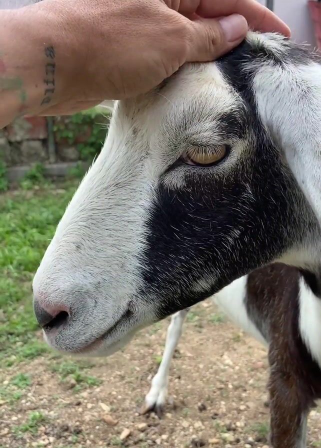 close-up of a white and black goat being petted on the head by a person. The person’s hand is visible, revealing a tattoo on their wrist. The goat stands on a patch of dirt and grass, with a building and fencing visible in the background. The goat has a leash attached to its neck. The camera remains mostly still, focusing on the goat and the person’s hand. The lighting is natural, suggesting an outdoor setting.