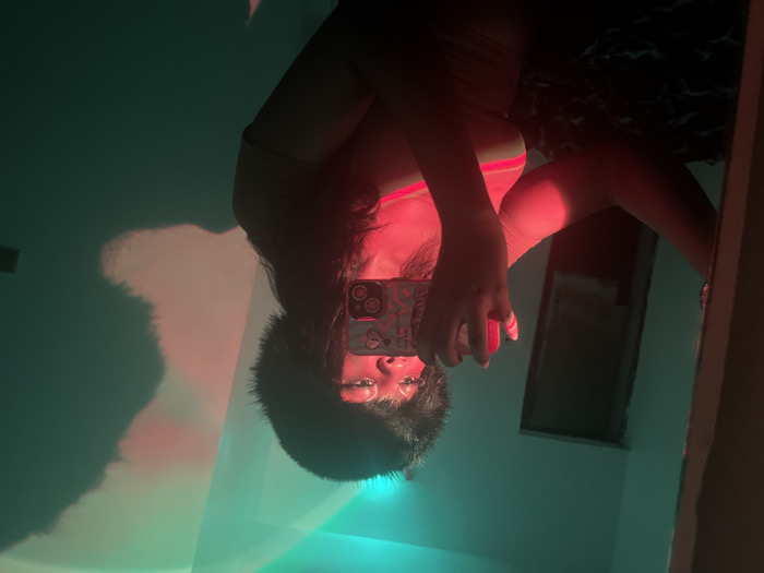 An individual with dark hair, partially covering their face, takes a selfie in a mirror. They wear a low-cut top, highlighted with a red light, and hold a phone with a decorated case. The mirror reflects a room with light green and red hues casting shadows on the wall. Part of a window or doorway is visible in the reflection.