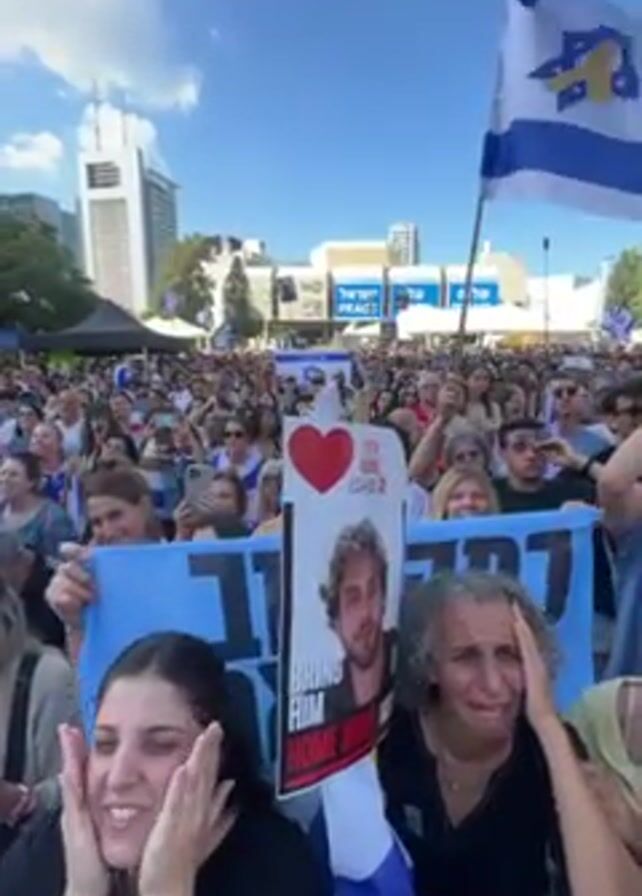 A large crowd of people stand outside in what appears to be a city square. Some people in the crowd hold Israeli flags. A woman with short curly gray hair is crying, putting her hand on her face. To her left is a poster with the words "Bring Him Home Now!" beneath a picture of a young man. The poster also has a heart sticker attached to it. To the woman's left, another woman with dark hair and dark eyes has her hands on her cheeks. The sky is blue. Skyscrapers are visible in the background.