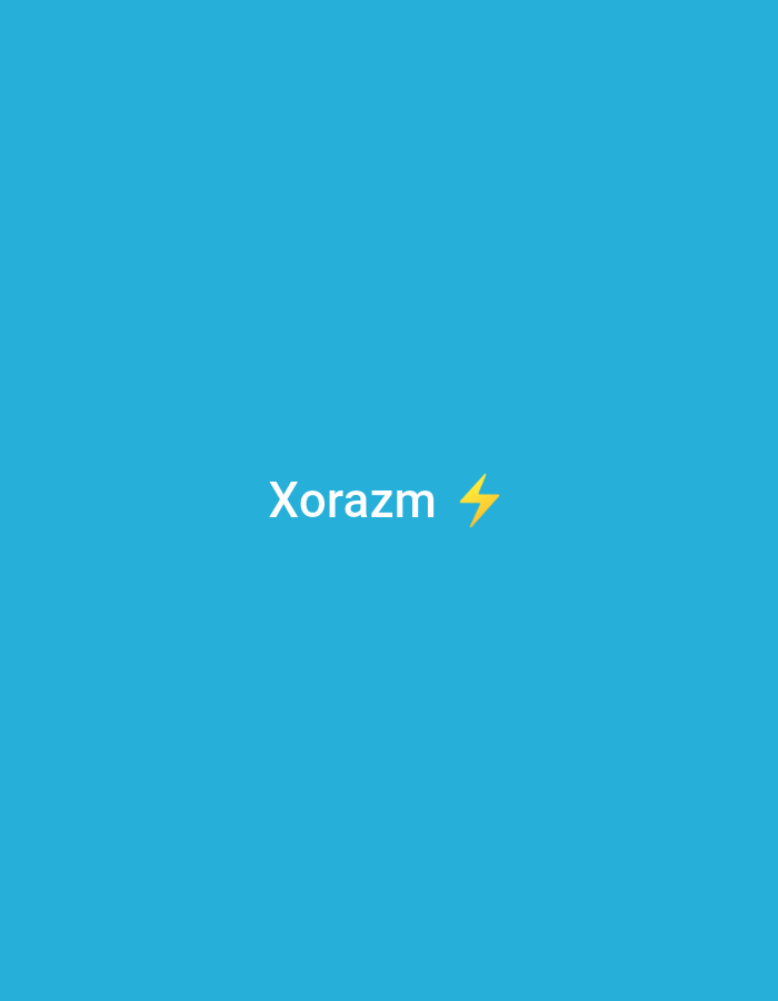 The image displays a solid light blue background. Centered horizontally and vertically on this background is the white text "Xorazm" rendered in a sans-serif typeface. Immediately to the right of the word "Xorazm" is a yellow lightning bolt emoji. No people, discernible objects other than the text and emoji, actions, or environmental details are present. The location in the city of Unknown, Unknown cannot be determined from this graphic image.