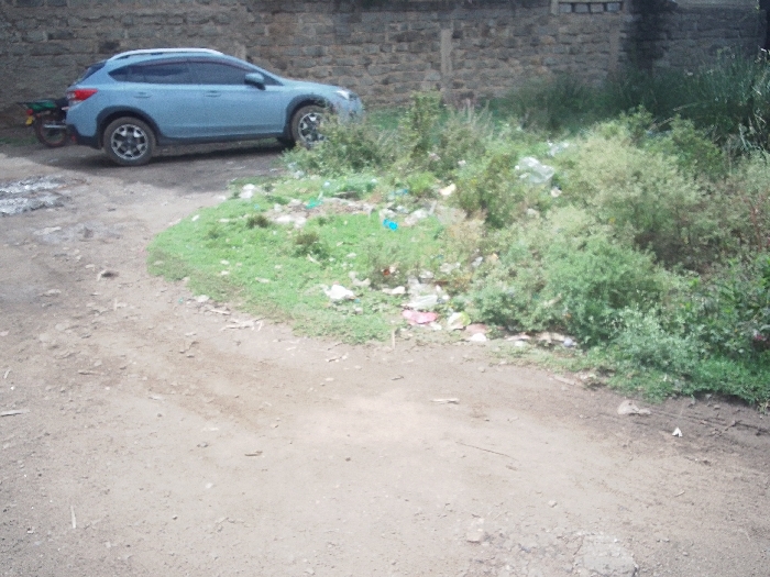 The scene depicts an unpaved area in Juja ward, Kenya. In the foreground, a light brown dirt path extends across the lower portion of the image, showing tire impressions. To the left, a light blue Subaru XV crossover SUV is parked on a dirt shoulder, facing obliquely towards the right. Partially obscured behind the SUV's rear is a green and black motorcycle. To the right of the dirt path, an overgrown area of mixed green weeds and shrubs contains scattered debris, including white and blue plastic bags and various wrappers. In the background, a stone wall, constructed from light-colored, irregularly shaped stones, runs horizontally. No people are present.