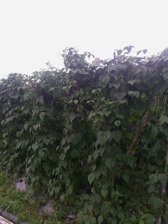 A dense wall of lush, green bean plants fills the frame, their foliage thick and abundant. Long, slender bean pods hang amidst the leaves, some reaching the ground. A wooden structure supports the heavy vegetation. At the base, weeds grow. The sky is overcast and light in colour.