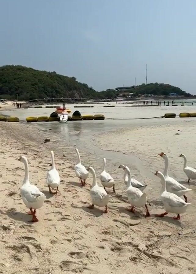 flock of about ten white geese on a sandy beach. The birds are mostly standing or walking calmly, some looking towards the camera. Behind the geese, a person runs across the beach. In the background is an island with trees and buildings, and the sea. The sky is overcast.