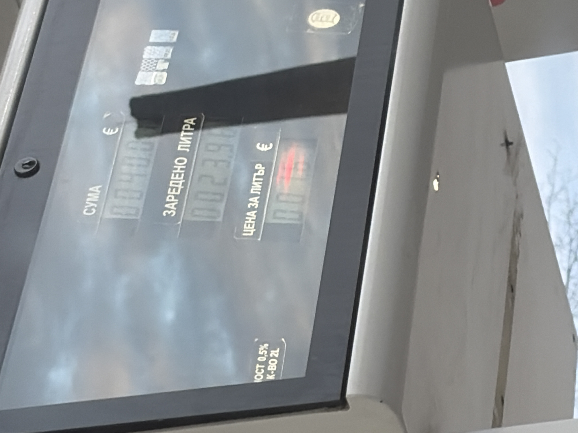 close-up of a gas pump display. The pump is displaying the amount of fuel dispensed in liters, the price per liter, and the total amount due in Euros. The fuel dispensed is 23.96 liters and the total amount due is 41.00 Euros. The location is likely in Lom, Bulgaria, as the text on the display is in Bulgarian. The pump also has a sticker indicating it has been certified. The photo's angle suggests it was taken from slightly above and to the side.
