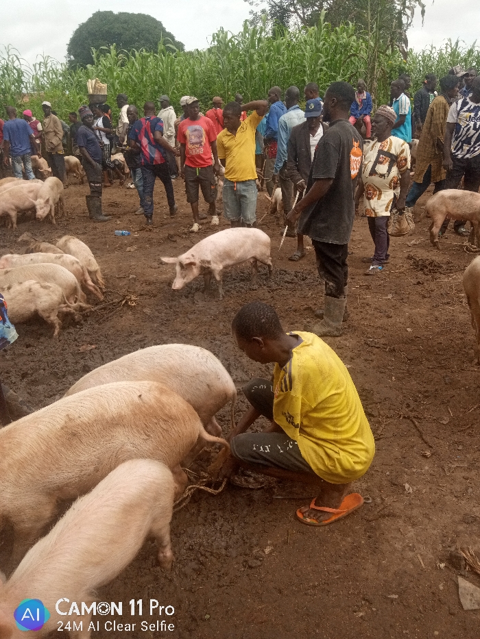 - "The image depicts an outdoor pig market or gathering in Unguwan Rimi, Nigeria, under an overcast sky" by FM-ArV563, licensed under CC BY 4.0