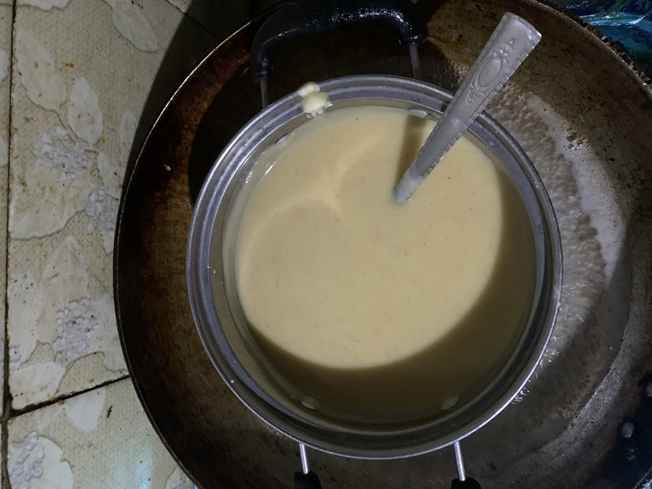 This image captures a kitchen scene in Maigizo, Nigeria. A silver-colored metal pot, approximately three-quarters full of a light yellow, viscous liquid, occupies the center. A silver metal spoon, featuring an embossed design on its handle, is partially submerged in the liquid, resting against the pot's rim. The inner pot, equipped with black handles, is situated within a larger, dark, and visibly seasoned or stained metal pan. Evident froth or liquid residue surrounds the base of the inner pot within the larger pan, indicating a heating process. The background reveals a tiled wall composed of light-colored, patterned ceramic tiles with visible grout lines and some surface discoloration. No individuals are present in the frame.