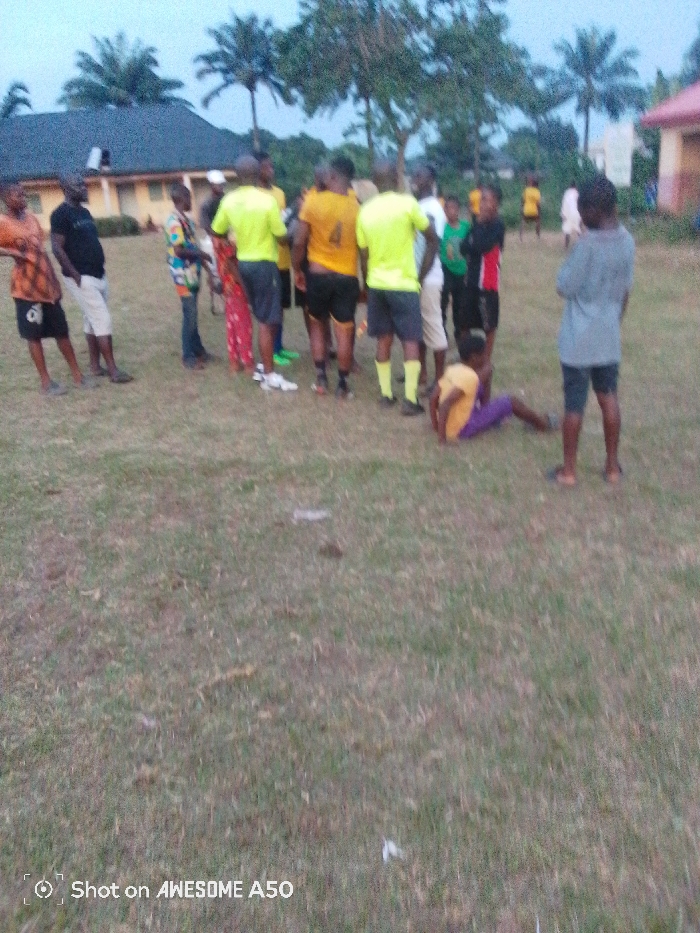 A group of people, mostly men, stand on a grassy field near some buildings and palm trees. Some of the men wear athletic jerseys in bright yellow or orange with numbers on the back, while others are casually dressed. One person sits on the ground in front of the group. The field is overgrown and brown in places. The overall image quality is grainy and the scene appears to be outdoors in the late afternoon or early evening.