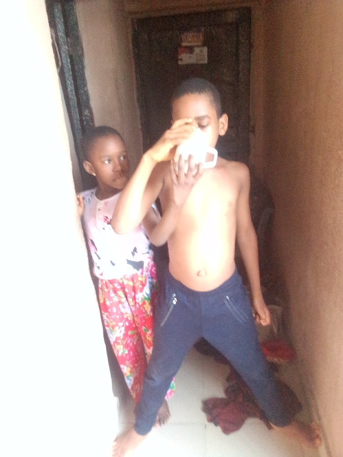 Two young children stand near a doorway. The boy is shirtless, wearing dark pants with zipper details, and drinks from a white mug. A girl in a floral top and red pants stands behind him, looking to the left. Bare feet are visible. The surrounding area appears to be a hallway with a dark doorway in the background.