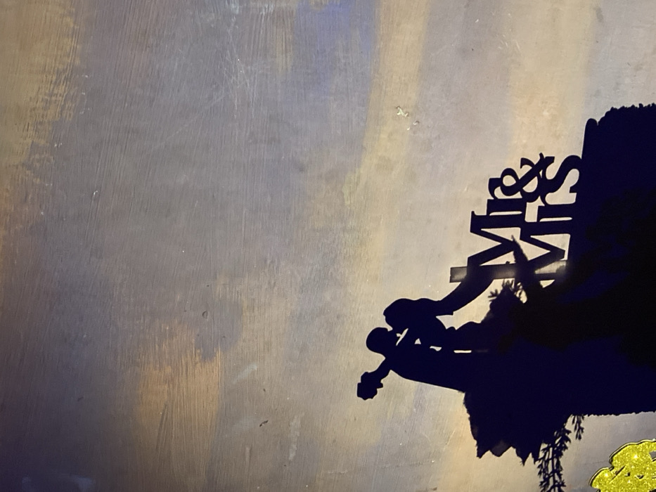 The image displays a dark, silhouetted wedding cake topper positioned against a muted, textured background