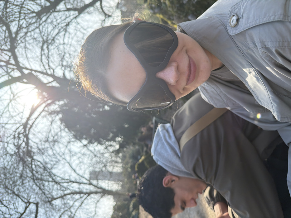 The scene depicts two individuals in Parco Sempione, Milan, Italy, under bright sunlight. In the foreground, an adult female with brown hair, wearing a light-colored trench coat, is positioned slightly angled towards the camera. She wears large, dark, wrap-around sunglasses featuring a wavy, butterfly-like frame. Her lower face is visible, displaying a subtle upward curve of the lips and freckles across her nose. Behind and to her left, an adult male with dark hair is seated, partially facing away from the camera. He wears an olive-green jacket over a light grey hooded sweatshirt, with a light brown strap visible across his back. He appears to be looking downwards. The background features numerous bare deciduous trees against a bright, hazy sky, indicating a late autumn or winter setting. A prominent lens flare is visible in the upper right. In the far left background, the slender white structure of the Torre Branca is discernible. Distant, blurred figures of other people are scattered throughout the park environment. The immediate ground surface appears light-colored, consistent with a dirt or gravel path.