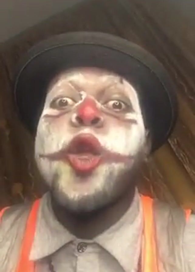 A man wearing clown makeup, a grey shirt, orange suspenders, a black hat, and a beaded necklace is speaking directly to the camera. His face is mostly covered in white makeup, with red around his lips and nose. He has a beard, and his eyes are wide. He alternates between pursing his lips and smiling, showing his teeth. The background is a wall covered with a gold-colored textured material.