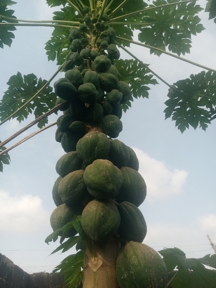 - "A vertical low-angle shot captures a mature papaya tree (Carica papaya) densely laden with numerous green, unripe fruits of varying sizes" by FM-ek8BD3, licensed under CC BY 4.0