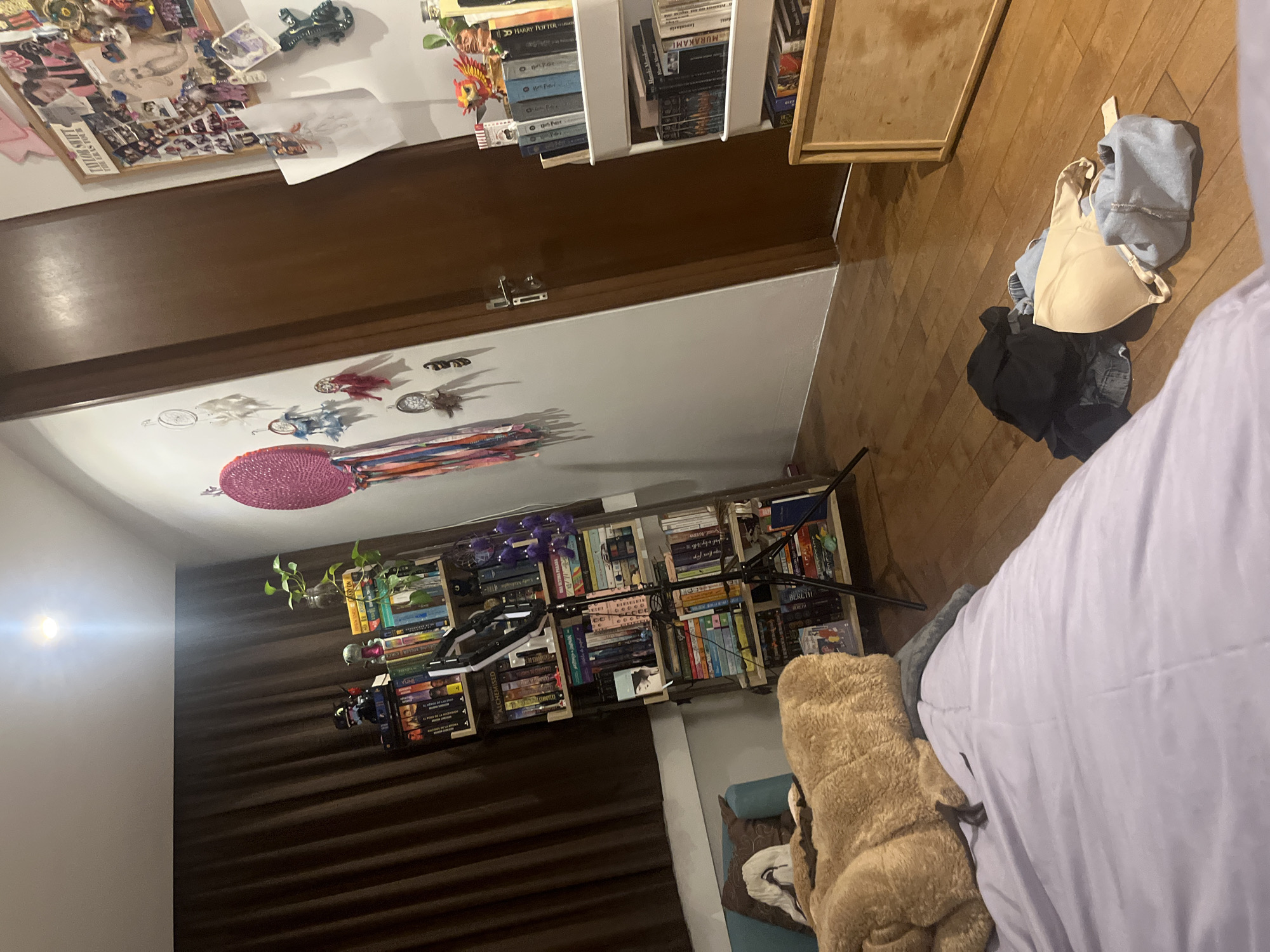 cluttered bedroom in Mexico City, Mexico. The foreground is dominated by a bed with light purple sheets and a large, brown stuffed animal. On the wooden floor to the right of the bed are scattered clothing items, including a bra, a light blue hoodie, and black clothes. The room has wooden floors and white walls. A dark brown door is visible, above which hangs a collage and some drawings. Two bookshelves are filled with books, one mounted on the wall near the door and another standing against a wall opposite the bed. The second bookshelf also holds plants. Dark brown curtains hang in the background. A light source, possibly a window, is visible behind the curtains.