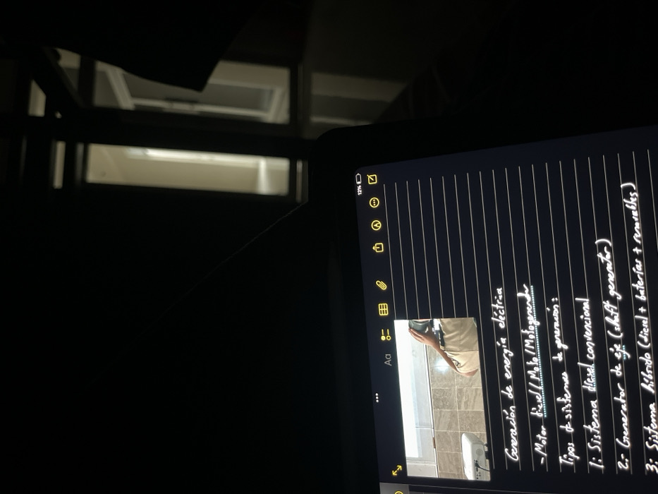 A low-light indoor scene features a tablet displaying digital notes on "Generación de energía eléctrica" (Electric power generation). The notes detail "Tipos de sistemas de generación" (Types of generation systems), including "Sistema diesel convencional," "Generador de eje (shaft generator)," and "Sistema híbrido (diesel + baterías + renovables)." The tablet's interface shows a 12% battery charge and various note-taking application icons. A small inset image or video frame on the tablet shows a partial view of a person's right arm and shoulder, wearing a light-colored short-sleeved shirt, with a tiled wall and a white object, possibly a projector, in the background. The immediate foreground is dark, while the background of the main scene reveals an out-of-focus, brightly lit vertical opening, likely a doorway or window, leading to an adjacent interior space. Reflections are visible on a dark, polished surface in the lower right background. The environment suggests a modern, residential, or office setting. No specific landmarks or unique architectural features are discernible to precisely locate this scene within Veracruz City, Mexico; however, the Spanish language on the tablet is consistent with a Mexican location.