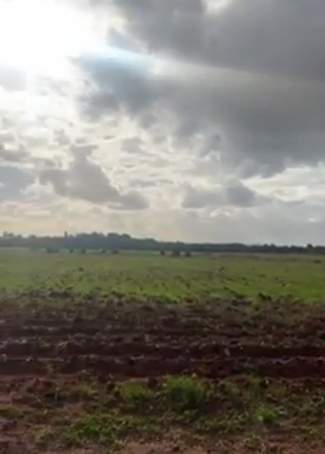 partially plowed field under a sky full of clouds. The sun is shining brightly behind the clouds, creating a glare. Part of the field is covered with green vegetation. A building can be seen in the distance. The foreground consists of dirt. The camera pans slowly upward.