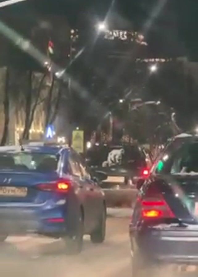 street scene at night, likely in a city, from inside a car. Other cars are visible in front, with their tail lights illuminated. The street is wet, and there may be snow or slush on the ground. There are trees and streetlights visible on the sides of the road. A group of people can be seen crossing the street. The overall lighting is dim.