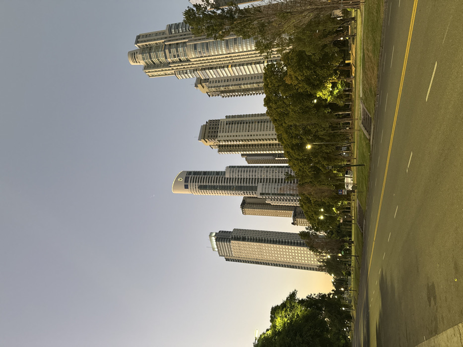 The image displays an urban twilight scene in Puerto Madero, Buenos Aires, Argentina. In the foreground, a dark asphalt road, marked with solid yellow double lines and dashed white lane lines, stretches across the frame, appearing devoid of traffic. Beyond the road, a manicured green space or park features multiple trees, some with dense foliage, and illuminated streetlights casting a warm yellow glow. Steps lead from the road level into this park area. In the background, a cluster of modern high-rise buildings dominates the skyline. Notable structures include a tall, white tower with a distinctive curved top and an illuminated "P" logo (Mulieris Tower), positioned centrally. To its right, another prominent multi-segmented tower (El Faro Towers) with numerous balconies stands. The sky above is clear, transitioning from a light blue at the zenith to a warmer, yellowish hue near the horizon, with a faint crescent moon visible near the Mulieris Tower. No individuals or active vehicles are discernible within the frame.