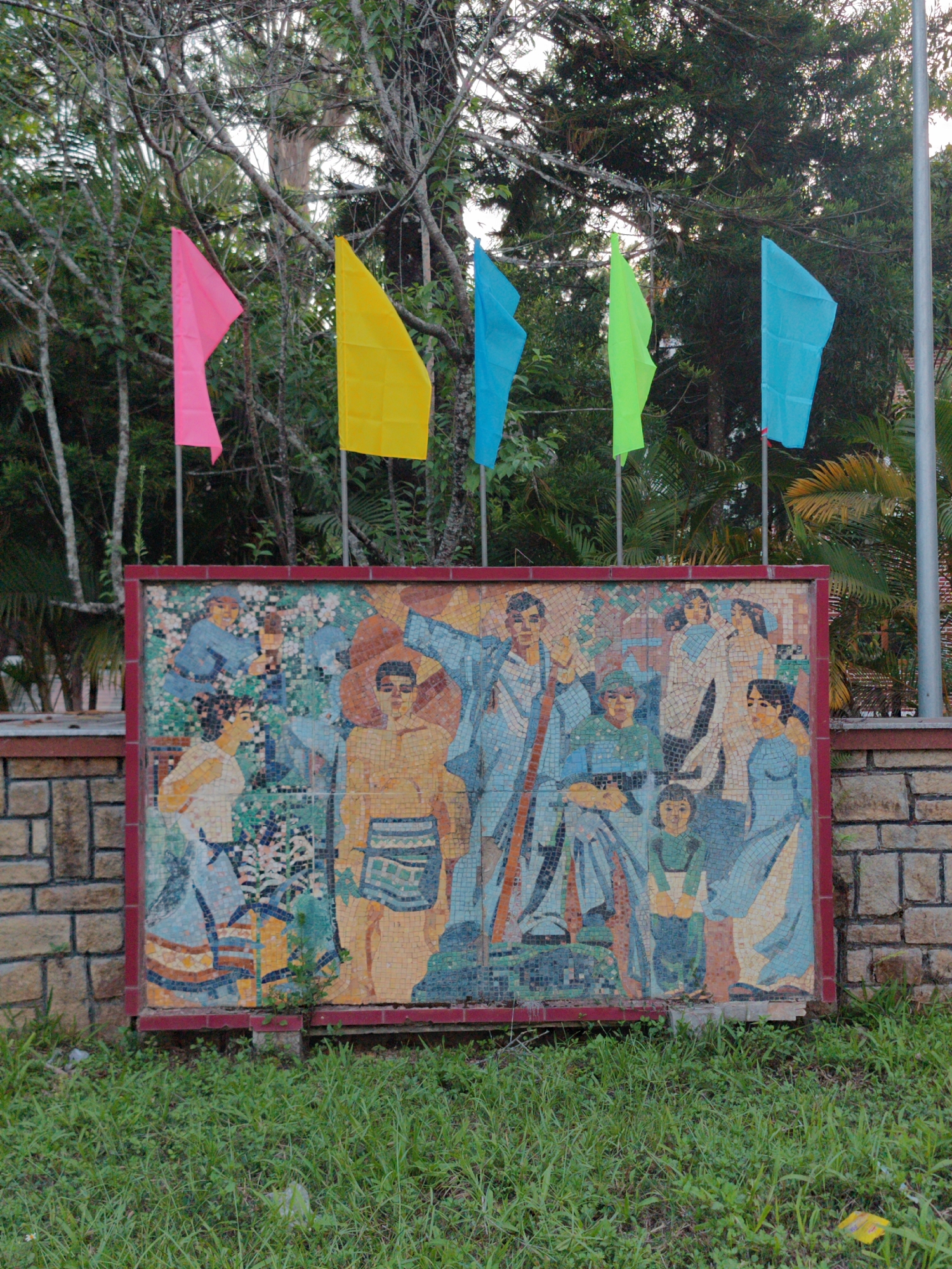 The image depicts a large mosaic artwork on a stone wall, positioned in front of a grassy area. The artwork, featuring a scene with people depicted in a mosaic style, is framed by a red border and shows figures dressed in various attires. The mosaic depicts men, women, and a child. Five flags of different colors (pink, yellow, blue, green, and blue) are placed behind the wall. The backdrop includes trees and greenery. The scene appears to be in Cam Ly - Đà Lạt, Vietnam.