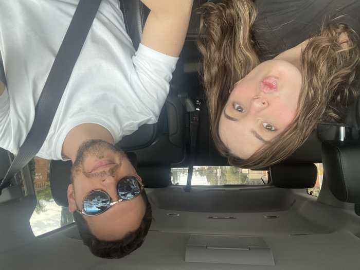 The image captures two individuals seated within a vehicle, viewed from a selfie perspective, in San Bernardino Tlaxcalancingo, Mexico