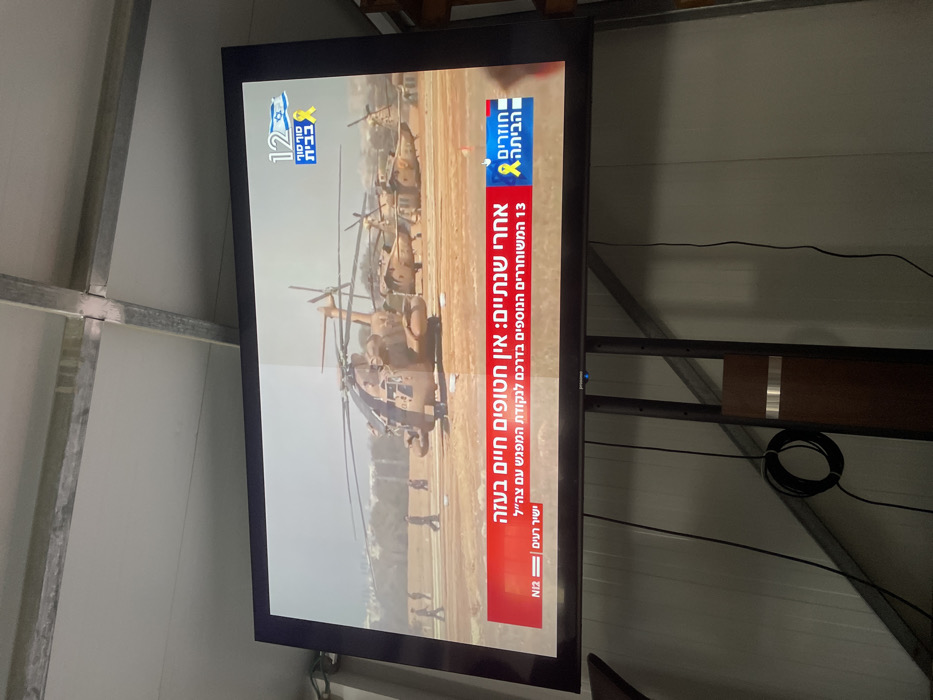 A large flat-screen television, mounted on a dark-colored stand with a vertical dark wood and silver-banded column, displays a news broadcast indoors. The image on the screen shows multiple tan-colored military transport helicopters, consistent with Sikorsky CH-53 Sea Stallions, parked on a dirt or gravel landing strip under a hazy sky. Several individuals, likely military personnel, are visible walking on the strip near the helicopters. Distant hazy hills or low mountains form the background. The television screen features several Hebrew text overlays: - In the top right corner, a graphic displays the number "12," an Israeli flag, the text "סוף טוב בבית" (A good ending at home), and a yellow ribbon icon. - A prominent red banner at the bottom of the screen contains further information: - On the far left, the "N12" logo is visible, followed by "שידור חי" (Live Broadcast) and "רעם" (Thunder/Roar). - The main headline on the left side reads in bold Hebrew: "אחרי שנתיים: אין חטופים חיים בעזה," which translates to "After two years: No living hostages in Gaza." - Adjacent to this, on the right side of the banner, it states: "13 המשוחררים הנוספים בדרך לנקודת המפגש עם צה"ל," translating to "The 13 additional released [persons] are on their way to the meeting point with the IDF." - On the far right of the red banner, a blue graphic with a yellow ribbon icon displays the text "חוזרים הביתה" (Returning Home). The television stand is positioned against a plain, light-colored wall. Above, the ceiling consists of light-colored panels supported by visible galvanized metal beams. A coiled black electrical cable is visible hanging behind the left side of the TV stand, with other thinner black cables extending downwards. The scene is located in the Hevel Eilot Regional Council, Israel.