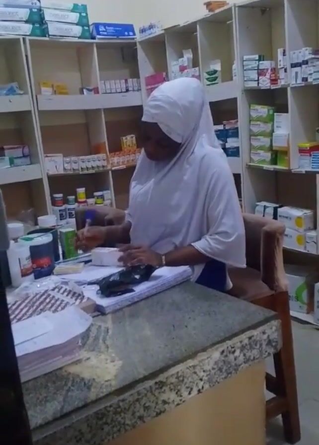 A young woman wearing a white hijab is sitting at a counter in what appears to be a pharmacy or dispensary
