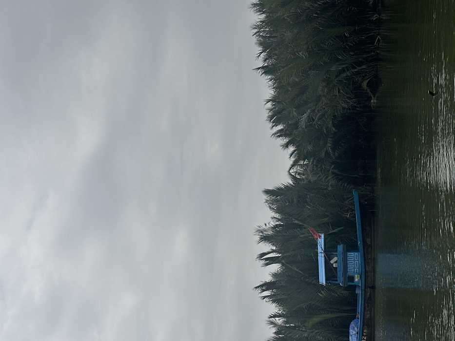 A partly cloudy sky hangs over a verdant landscape with water. Lush, dense palm trees line the water's edge. A blue, boat-like structure with a small flag is situated on the water. It appears to be docked alongside the vegetation, blending with the greenery. The scene evokes a sense of calm and tranquility, highlighting the natural beauty of a tropical environment.