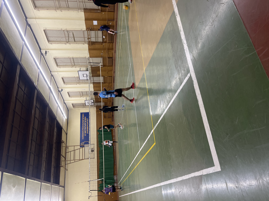 The image displays an indoor sports gymnasium located at the University of Chemical Technology and Metallurgy in Sofia, Bulgaria. The facility features a green and tan-colored court with white and yellow demarcation lines, set up for volleyball with a net spanning the center. Basketball hoops are also mounted along the far wall, which is beige/light brown and contains several tall, barred windows. A large blue banner with white Cyrillic text, reading "ХИМИКОТЕХНОЛОГИЧЕН И МЕТАЛУРГИЧЕН УНИВЕРСИТЕТ" (University of Chemical Technology and Metallurgy), is affixed to the wall above the net. The ceiling is composed of dark wooden panels with long, linear fluorescent light fixtures providing illumination. Approximately nine individuals are present on the court, engaged in or observing what appears to be a volleyball game or practice. In the foreground, a male in a blue and black athletic shirt, black shorts, and red athletic shoes stands with his back partially to the camera, facing the net. To his left, another male in a purple shirt is holding a yellow volleyball. A third male in an orange and white shirt is mid-stride near the net. Other participants, mostly male and dressed in various athletic wear, are positioned around the court. One male in a blue tracksuit is seated against the far right wall. The court surface shows visible wear, including scuff marks and faded paint in areas. A wooden ladder leans against the wall on the left side of the court.