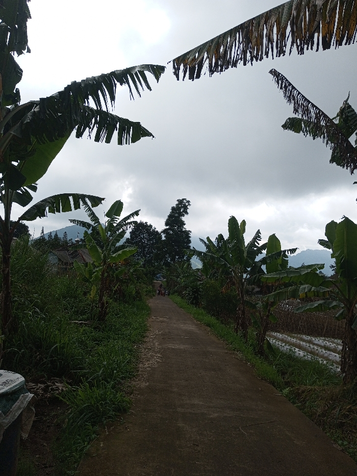 The image displays a rural pathway in Kondha, India, under an overcast, grey sky. The unpaved, light brown path extends into the distance, flanked by dense vegetation. On the immediate left, tall green grass and several banana trees with large, often frayed leaves are visible. A partially obscured white bag, possibly branded "ABC," is situated in the lower left foreground. On the right side of the path, more banana trees and grass line the edge, leading to a cultivated field in the mid-ground, characterized by distinct parallel rows of white plastic sheeting or pipes. Further down the path, a small group of three to four indistinct individuals is observed walking away from the viewer. In the mid-ground, a cluster of residential buildings with visible roofs is discernible, backed by a range of distant mountains under the cloudy sky.