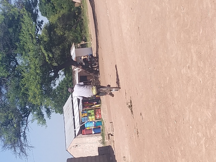 The image displays a daytime scene in Arusha, Tanzania. A male individual, observed from the rear, cycles a bicycle on a reddish-brown dirt surface. He wears a light-toned shirt, dark trousers, and a dark cap. A light-colored bundle is affixed to the bicycle's rear. In the mid-ground, a single-story building with light-colored walls and a corrugated metal roof operates as a retail establishment, displaying blue barrels and various colorful plastic goods externally. A large tree with green foliage stands centrally in the background. Beneath this tree, two motorcycles are parked, and one additional person is partially discernible near them. A partial structure of stacked, unmortared bricks is visible on the far left. The sky is clear, and shadows are present due to direct sunlight.
