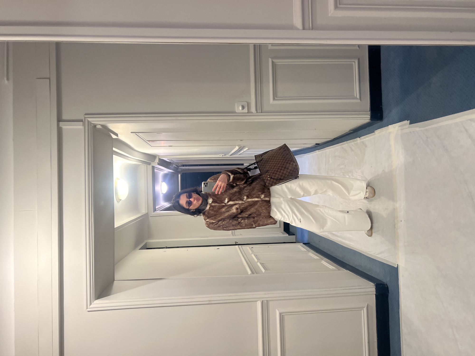 The scene depicts a female individual taking a mirror selfie in an interior hallway within a building in Paris, France. The hallway features white paneled walls with detailed classical moldings (boiseries) and a blue carpeted floor. A significant portion of the carpet in the foreground and extending down the corridor is covered by white protective sheeting. The subject is an adult woman with dark hair, wearing small, dark, oval-shaped sunglasses. She is dressed in a short, dark brown, fur-like jacket with light buttons, a light-colored high-collared top, loose-fitting white trousers, and light-colored flat shoes. She holds a silver-cased smartphone in her right hand, pointed towards the mirror to capture her reflection, with her lips slightly pursed. A brown, monogram-patterned tote bag with dark trim is slung over her left shoulder. The hallway is uniformly lit by overhead fixtures. Two doorways with white trim are visible, framing the perspective down the length of the corridor.
