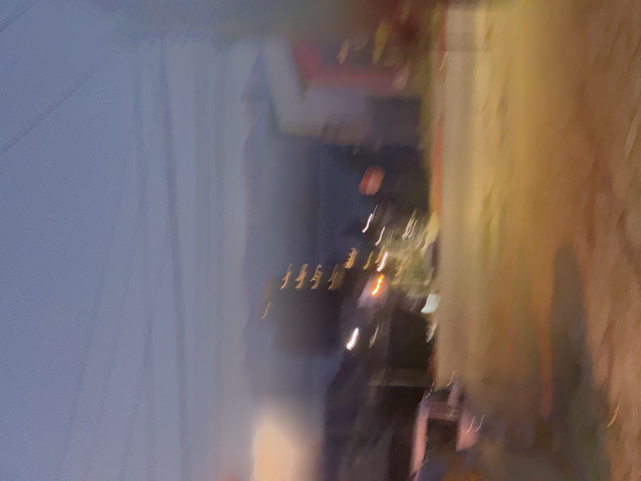 Blurred and distorted image of a street scene. Visible elements include buildings, streetlights, and utility wires against a dusky sky. The image is rotated, obscuring detail and creating a sense of motion or instability. Color tones vary from light blues and grays to yellows and oranges.