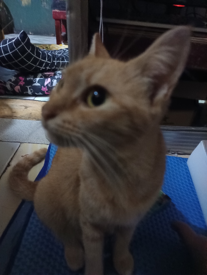 The image depicts an orange tabby cat sitting on a blue textured mat in an indoor residential setting in Sirnagalih, Indonesia