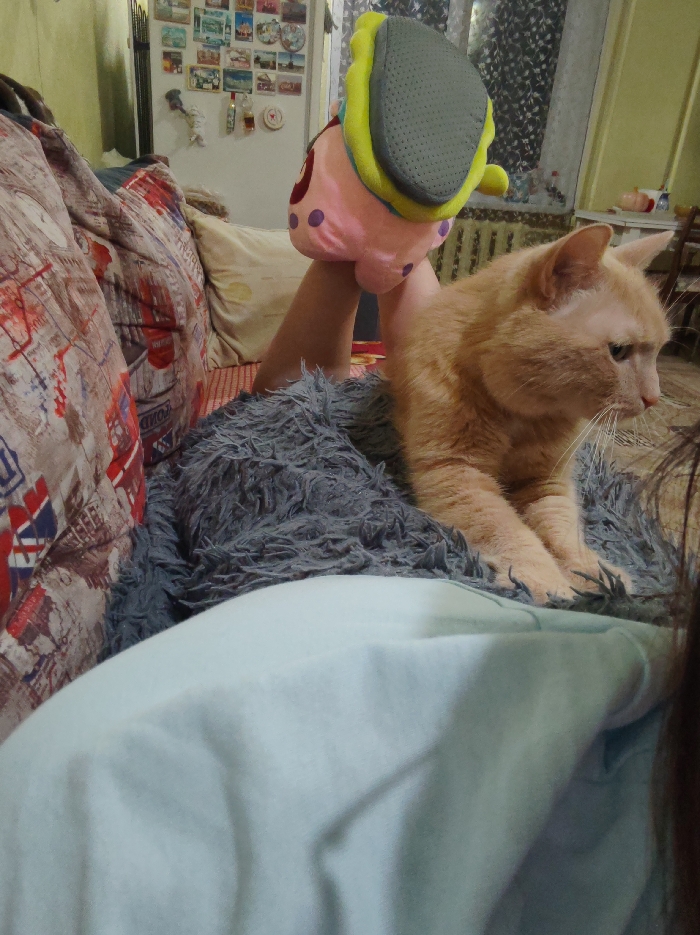 An orange cat is nestled on a gray, fluffy blanket on a bed. A person's leg is visible behind the cat, holding up a plush slipper. The bed is decorated with patterned pillows. A refrigerator with numerous magnets adorns the wall in the background. Light from a window illuminates the scene. A corner of a pale blue blanket and part of a person's dark hair are visible in the foreground.