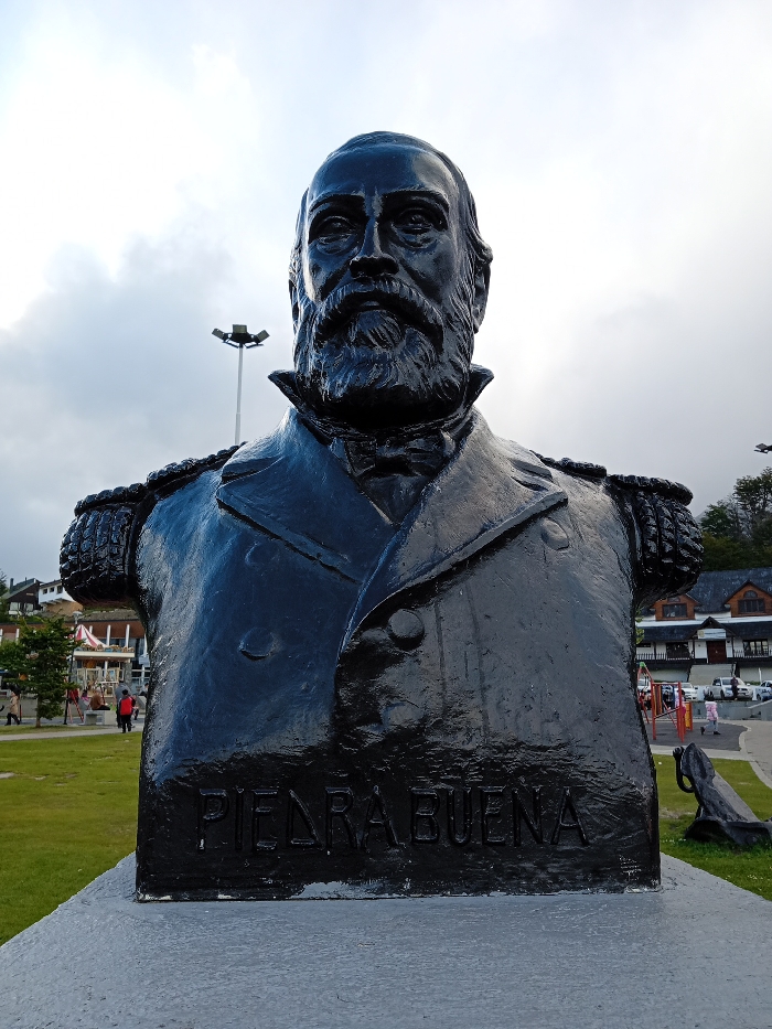 A black bust of a man with a beard, wearing a military-style uniform with epaulettes. The name "PIEDRABUENA" is engraved on the base. It sits on a gray pedestal in a grassy area. Buildings, people, and a playground are visible in the background. The sky is overcast, and a tall street lamp is to the left.