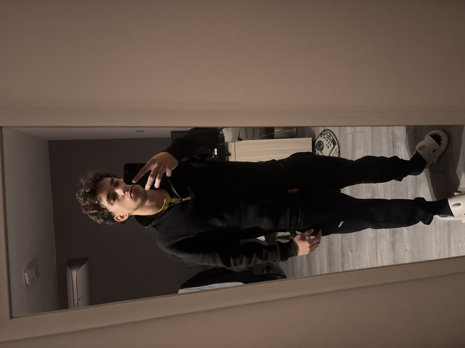 The image displays a full-body mirror selfie taken indoors, depicting a young adult male