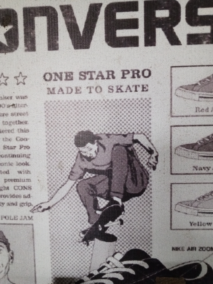 This image depicts a detail of a large-format print or banner, likely made of fabric, located in the city of Voa Yeav, Cambodia. The print exhibits a grayscale, halftone aesthetic, mimicking a newspaper or magazine layout. At the top, the partial word "CONVERSE" is visible in large, bold, sans-serif lettering. Below the "CONVERSE" text, a simulated newspaper column on the left details information about "Converse Star Pro" and "skater" culture, mentioning "90's era" and "iconic look." Further down, a fragment of a drawn male face in a cap is visible. The central portion features the prominent headline "ONE STAR PRO MADE TO SKATE." Directly beneath this, a dynamic illustration depicts a male figure actively skateboarding. The figure is shown mid-action, crouching over a skateboard with his left hand extended forward towards an unseen surface, against a background of uniform halftone dots. On the right side of the print, three distinct, vertically stacked framed images of canvas low-top shoes are displayed. Each shoe illustration is labeled with a color: "Red," "Navy," and "Yellow," from top to bottom. Below these shoe advertisements, the text "NIKE AIR ZOOM" is partially visible. The bottom section of the image features a pair of black athletic shoes with white laces and accents, depicted with higher resolution and clarity than the surrounding illustrations. These shoes partially overlay the lower part of the skateboarding illustration and the "NIKE AIR ZOOM" text. The entire surface of the print shows a subtle textile texture.