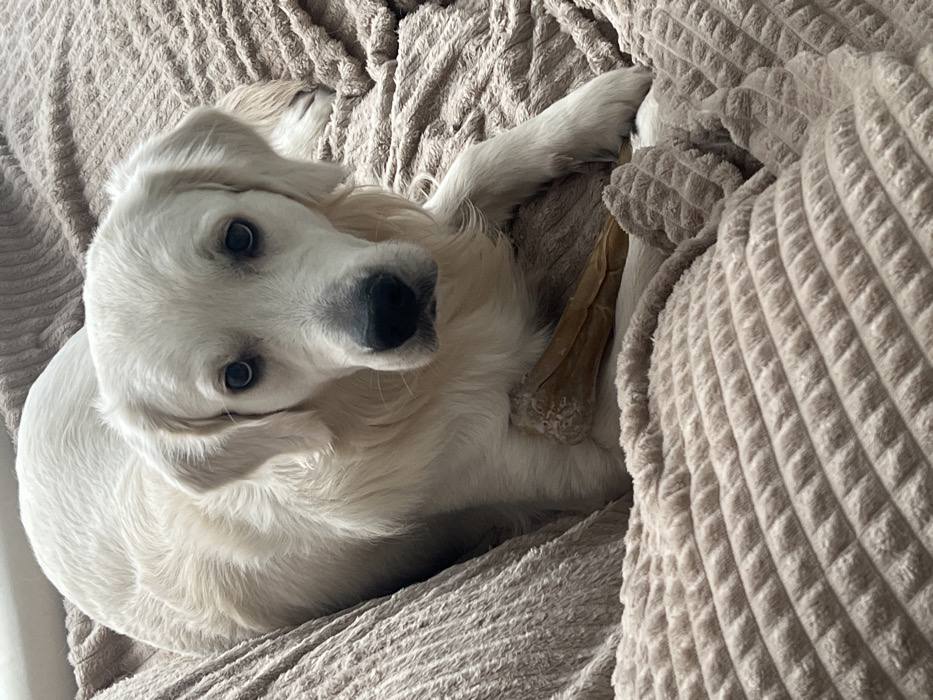 - "A cream-colored canine subject, consistent with a Golden Retriever breed, is depicted in a prone position on a light-brown, ribbed, plush textile surface, located indoors in Izhevsk, Russia" by FM-mWrWX2, licensed under CC BY 4.0