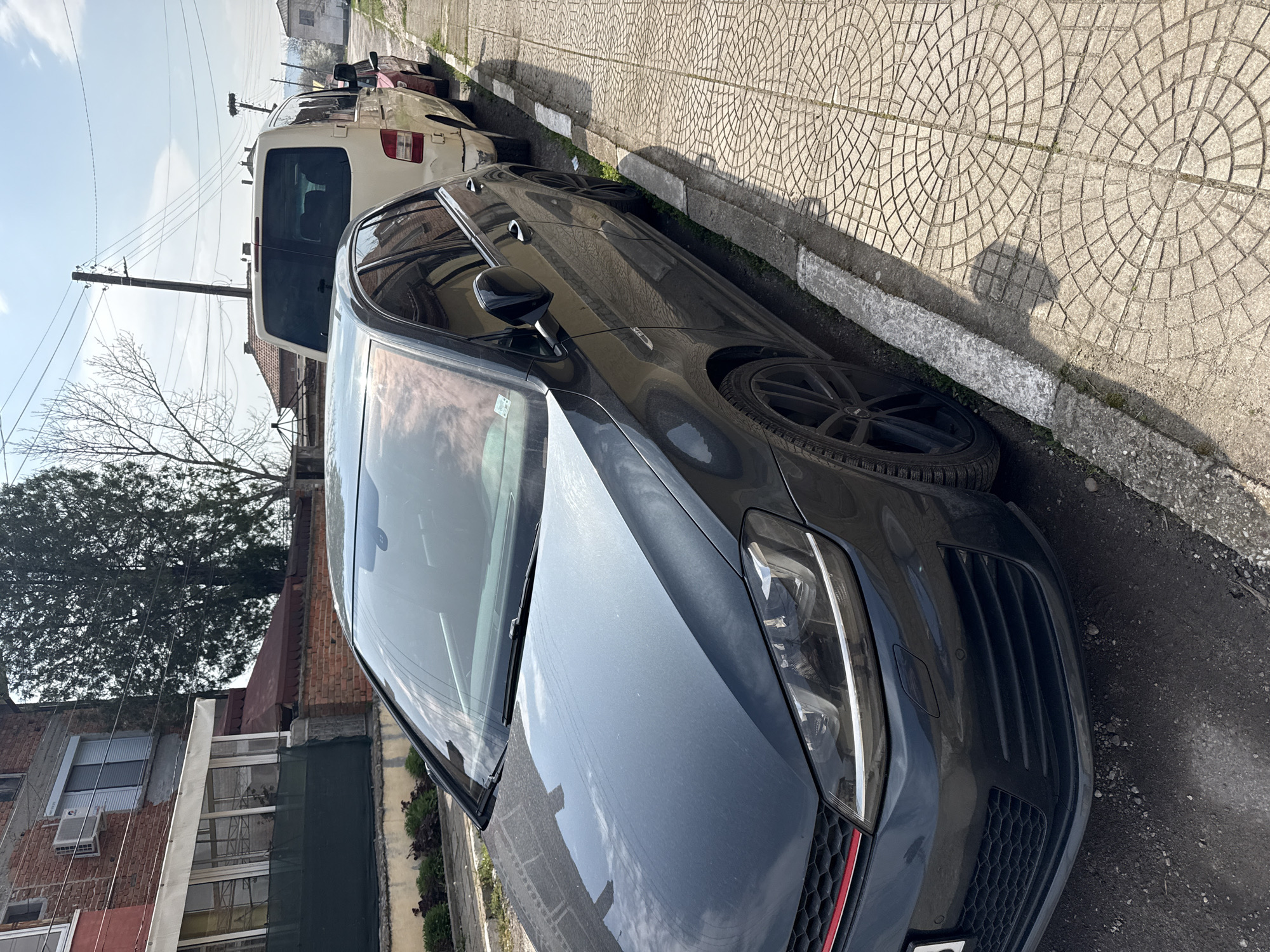 The image presents an outdoor, static scene on a sunny day in Dobrich, Bulgaria. A dark grey Volkswagen Golf Mk7 GTI is parked in the foreground on a dirt and gravel shoulder bordering a patterned concrete sidewalk. The vehicle's front left section is visible, featuring a headlight, a hexagonal grille with a red horizontal accent stripe, a lower bumper with visible parking sensors, and a black multi-spoke wheel. Reflections of the sky and surrounding environment are apparent on the car's hood and windshield. Behind the Golf, a cream-colored Mercedes-Benz Sprinter van is parked on the street, followed by a partially visible red sedan further down the thoroughfare. To the left, a multi-story brick building is visible, featuring white-framed windows on its upper floors and an external air conditioning unit on the second level. A white awning extends over a ground-floor patio enclosure equipped with multiple windows. A large evergreen tree stands behind the building, and smaller plants are situated along the base of the structure. The background to the right features multiple wooden utility poles supporting numerous overhead power lines against a light blue sky with scattered white clouds. The sidewalk is composed of light-colored concrete tiles arranged in circular patterns. Distinct shadows from the vehicles and utility poles are cast on the ground, indicating direct sunlight. No individuals or active interactions are present in the scene.