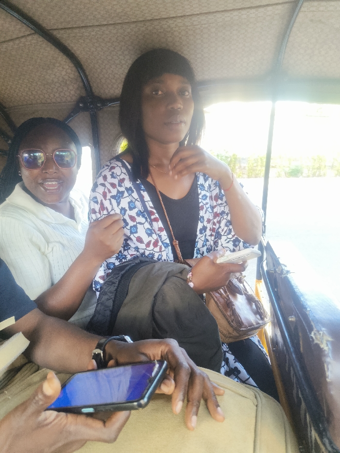 Two women ride inside an auto rickshaw, also known as a tuk-tuk. The woman on the left wears sunglasses and a light-colored shirt, while the woman on the right has on a floral patterned top over a dark shirt. A man's hand holding a cell phone is in the foreground. The interior of the tuk-tuk has a woven, textured roof. Outside the tuk-tuk, bright sunlight streams in.
