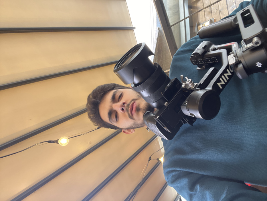A young adult male, appearing to be in his late teens or early twenties, with dark hair, a short beard, and a mustache, is depicted from the chest up, looking directly into the camera with a neutral expression. He is wearing a dark teal crew-neck sweater. He holds a professional black camera with an attached lens and lens hood, which is mounted on a black DJI Ronin RS4 gimbal stabilizer. The gimbal displays 'RONIN' (partially visible), 'RS4' branding, and the DJI logo. The environment is a semi-outdoor setting, likely a cafe or restaurant patio, featuring an overhead beige retractable canopy with dark structural beams. A string of incandescent light bulbs is suspended from the canopy, with one bulb prominently illuminated in the upper left portion of the image. The background to the right shows a blurred outdoor or interior structure. The specific location within Kafr Sousa Municipality, Syria, is not visually identifiable from the image content.