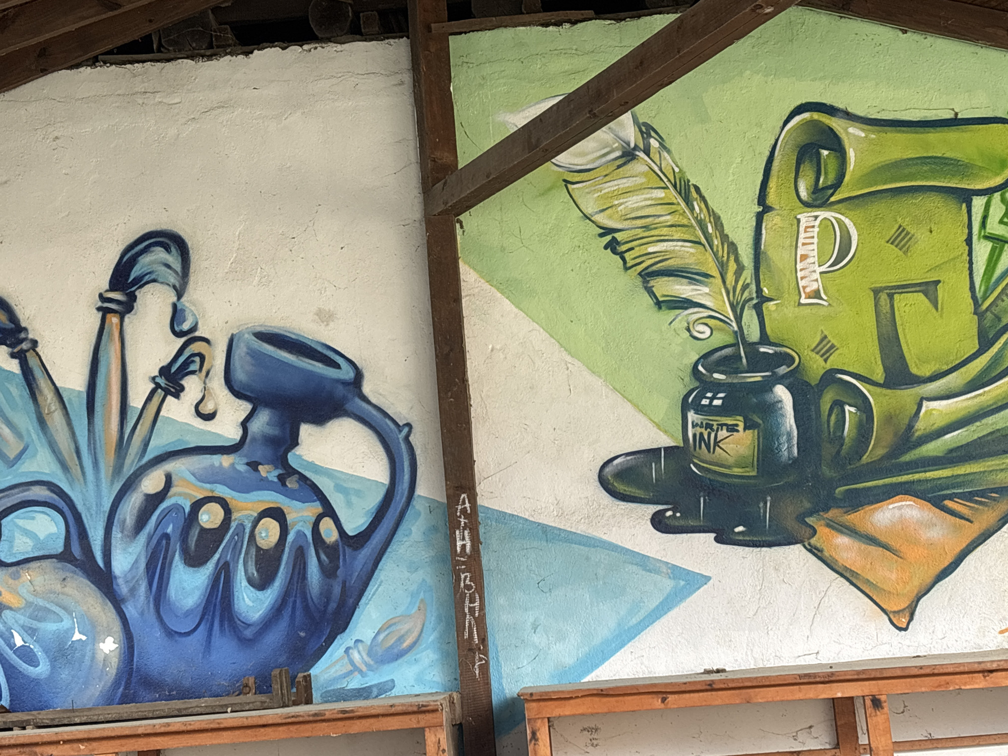 - "The scene depicts a section of an indoor wall in Troyan, Bulgaria, featuring two distinct graffiti murals separated by a dark brown wooden beam" by FM-heqyv1, licensed under CC BY 4.0