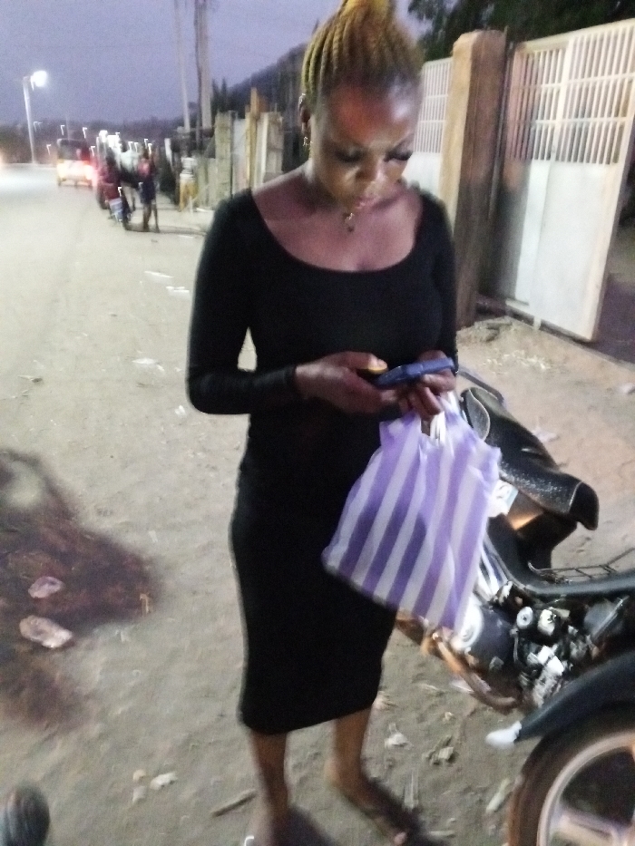 A woman in a tight black dress stands on a street at dusk, looking at a phone in her hands. She holds a purple and white striped bag. Next to her, a partially visible motorcycle is parked. The background includes a street scene with blurred figures and vehicles, along with tall fencing and building structures. The light is dim, casting shadows on the ground.