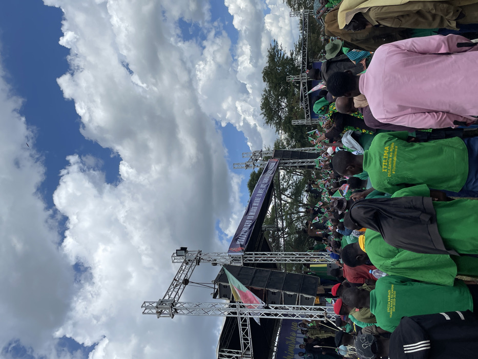 large crowd of people gathered in front of a stage in Bariadi, Tanzania, at coordinates -2