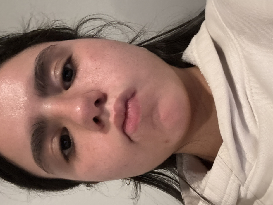 A close-up image showcases a young woman's face. She possesses fair skin, dark eyes, and full lips. Her dark hair is partially visible, with strands framing her face. She is wearing a white hooded sweatshirt. The angle is tilted, offering a slightly upward view of her face. Her expression appears neutral. The lighting is soft, highlighting her features and skin texture.